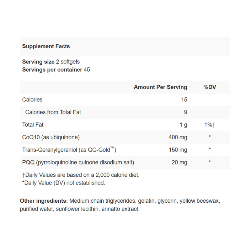 CoQ10 SuperMax is designed to be a mitochondria-targeting powerhouse that promotes cardiovascular health and cognitive function.* This advanced formula features geranylgeraniol (GG) as patented GG-Gold™. GG is essential in the mevalonate pathway, where it serves as a building block for CoQ10 and other critical biomolecules.* Yet, GG's benefits are far broader than just supporting CoQ10 and the mitochondria.* CoQ10 and pyrroloquinoline quinone (PQQ) are added to further support mitochondrial function.* High-energy demanding organs, like the heart and brain, rely on mitochondria, which are powered by CoQ10.*